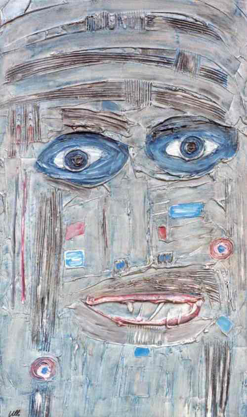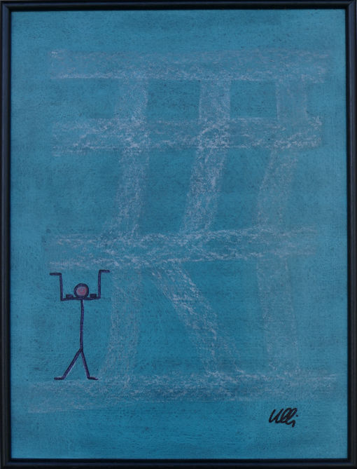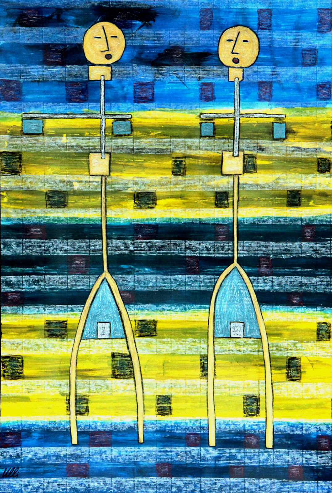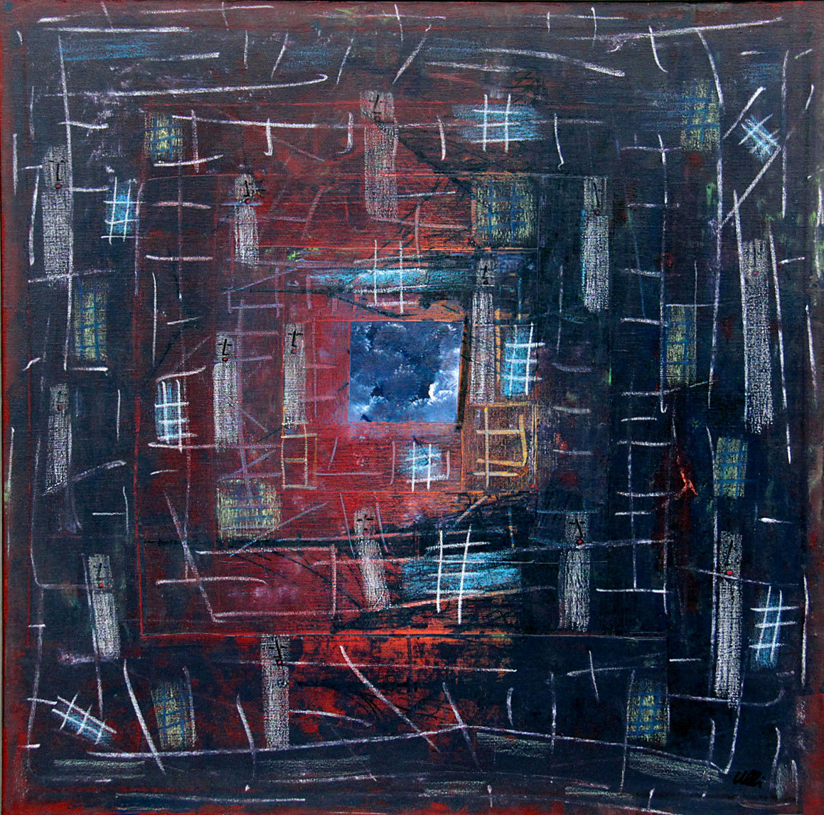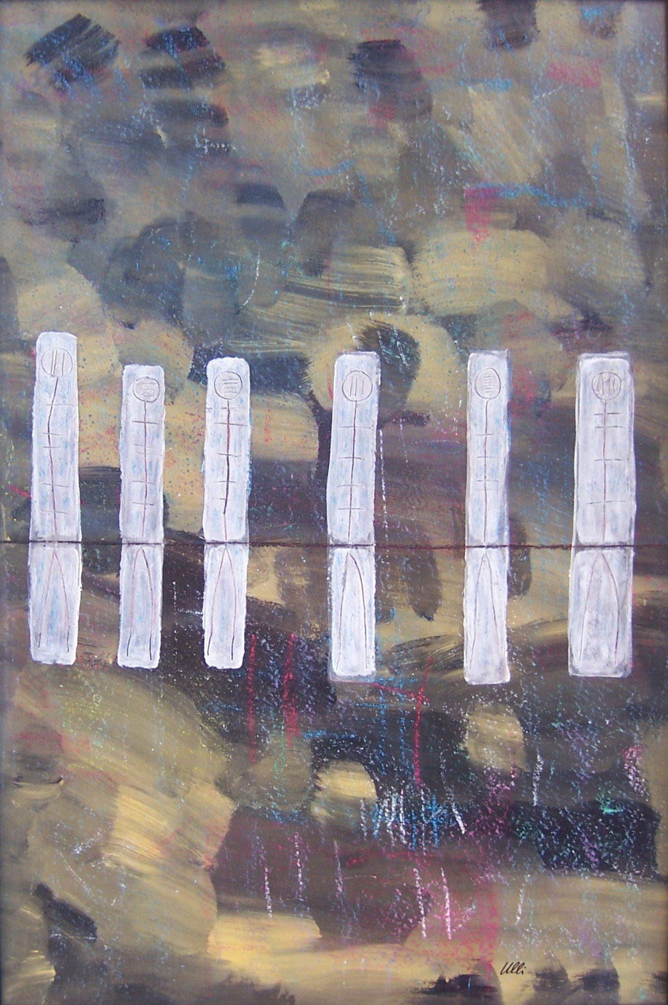 Die Figuren ähneln dem vorherigen Bild, sie sind nun alle gleichmäßig verteilt, scheinen festgebunden, gefesselt? Der Raum im Hintergrund öffnet sich und gibt eine Blick in den vom Mond erleuchteten Nachthimmel frei. Ein rätselhaftes Bild voller Tiefe...