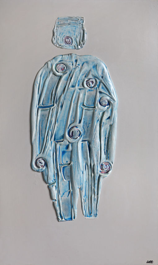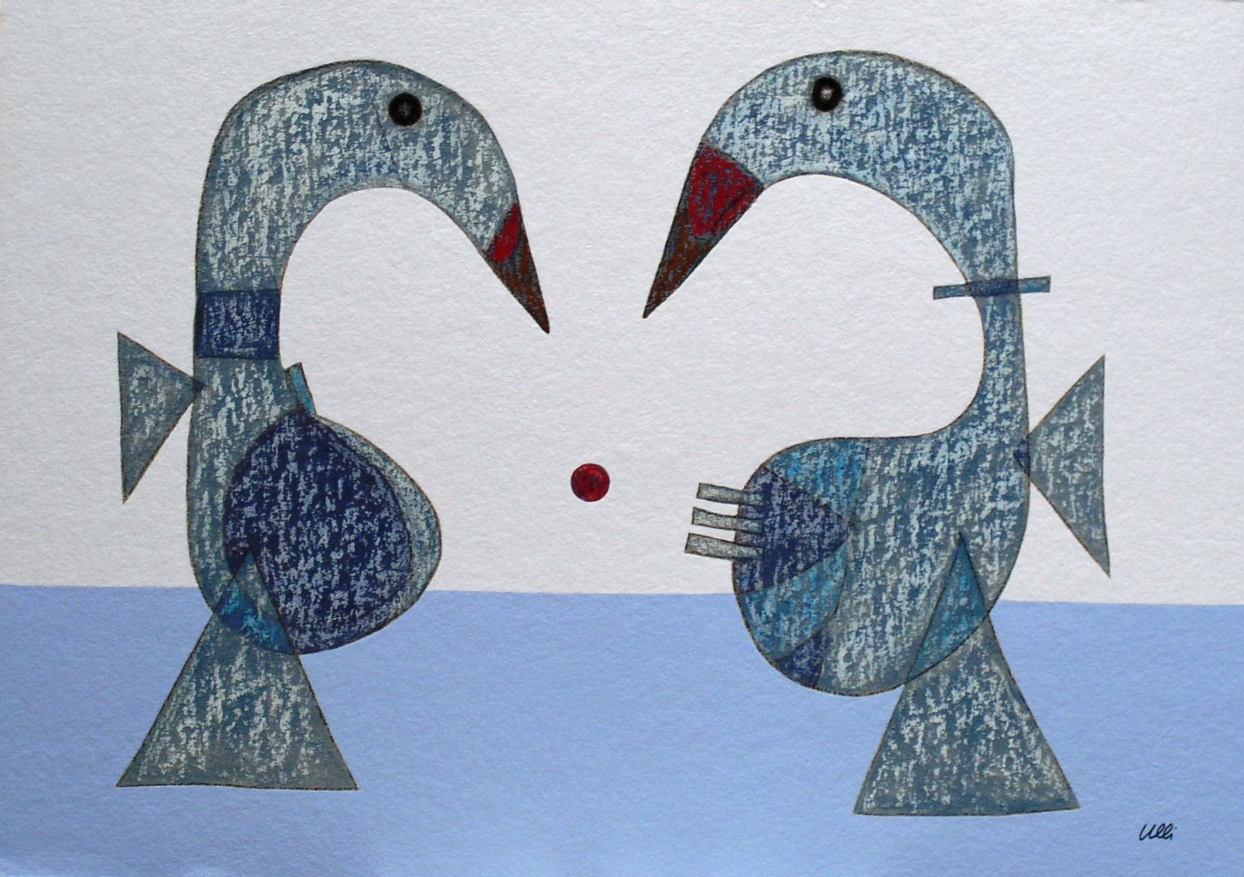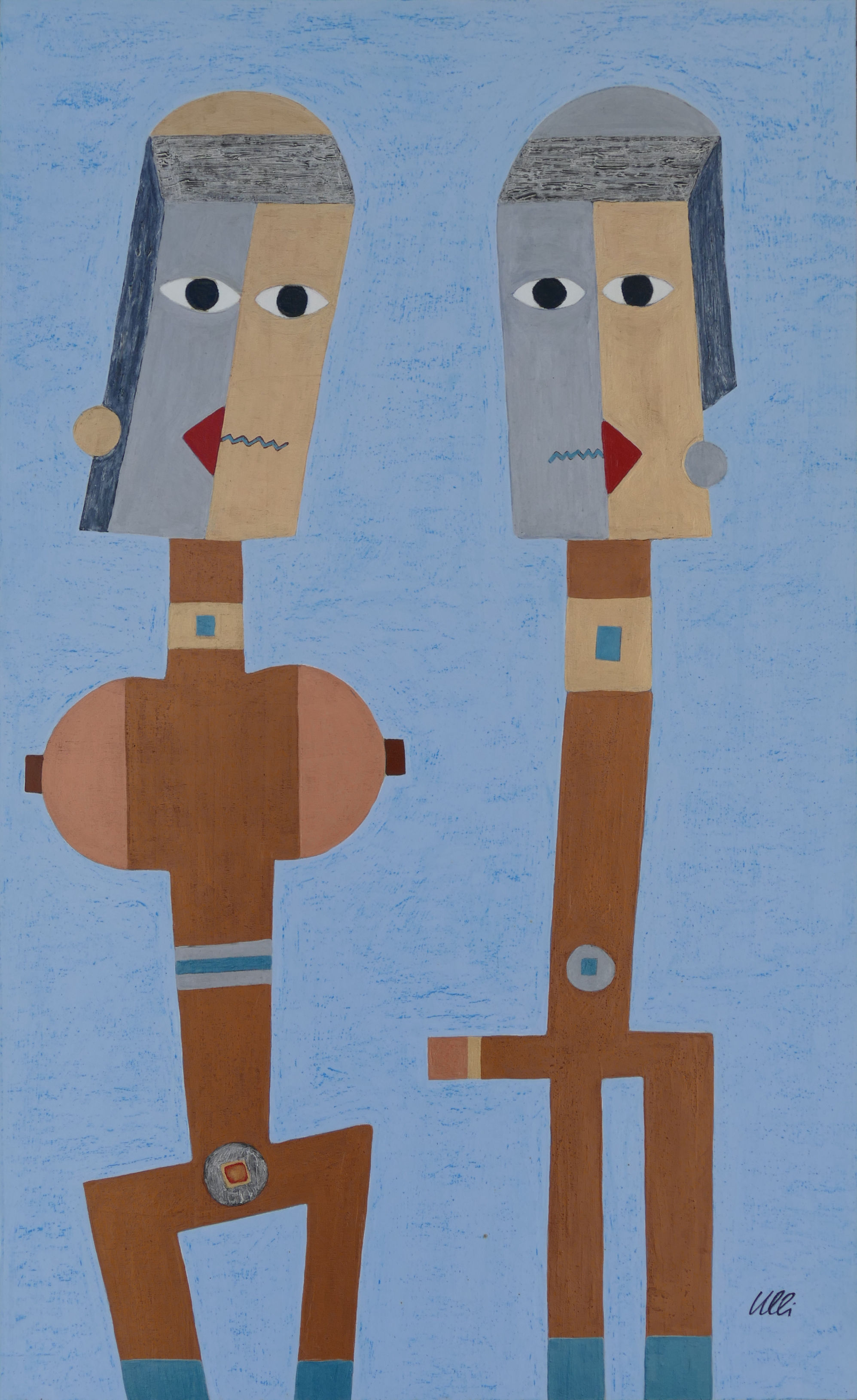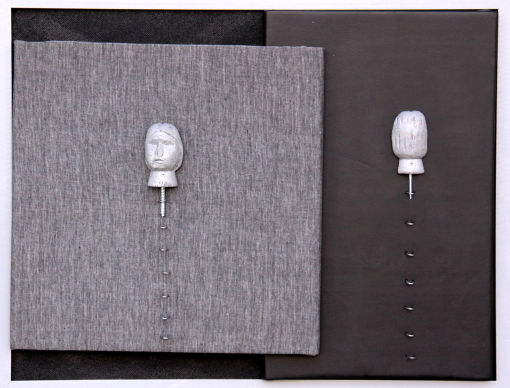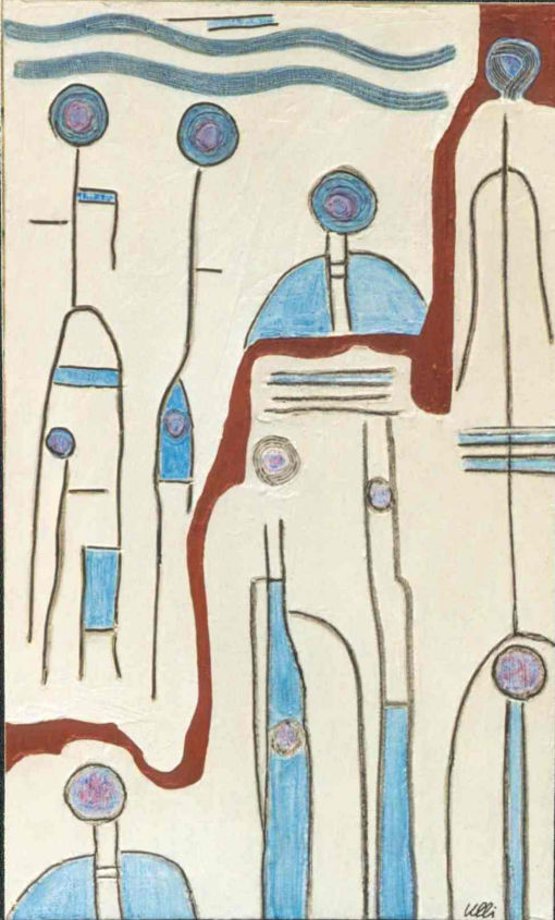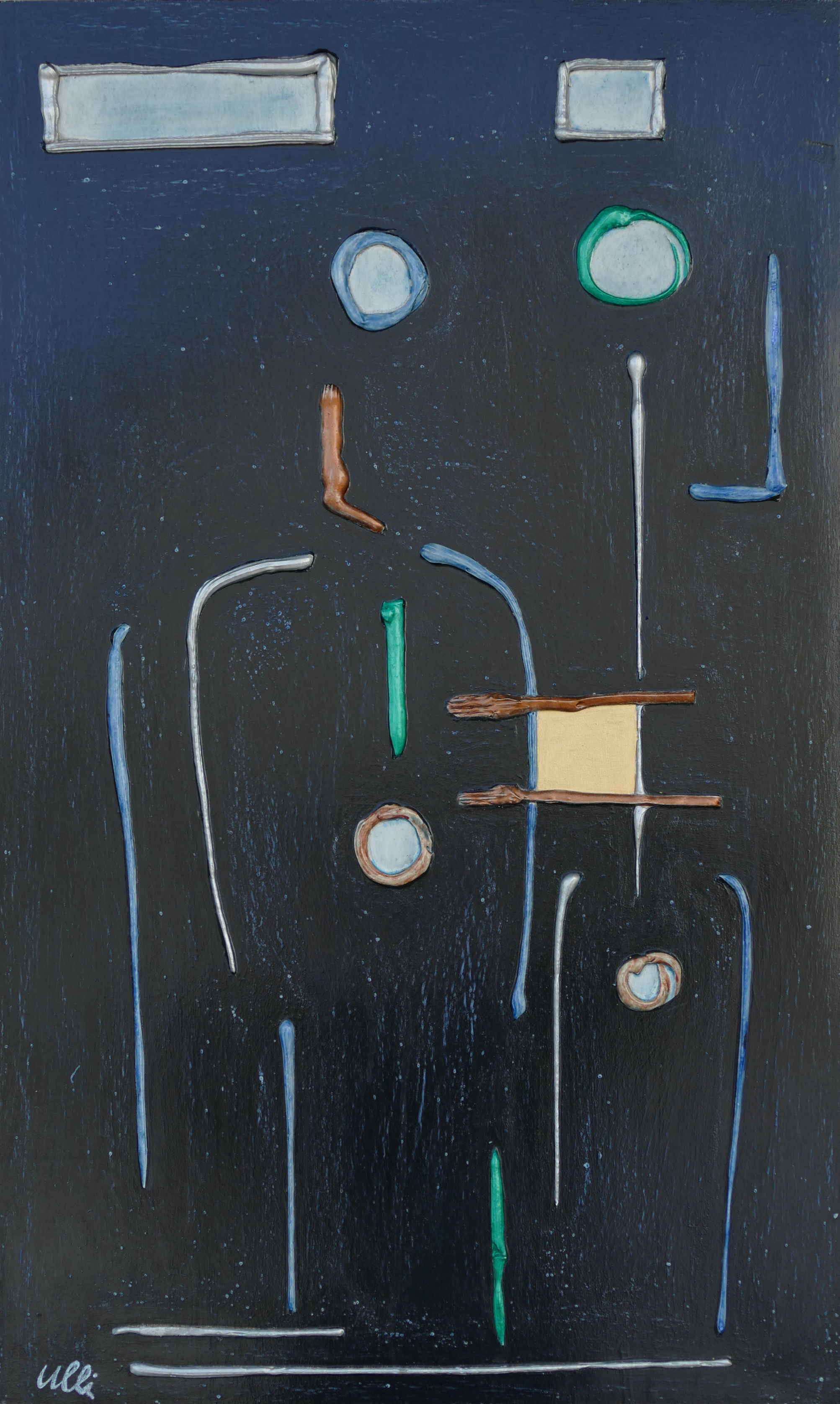 Die Figuren ähneln dem vorherigen Bild, sie sind nun alle gleichmäßig verteilt, scheinen festgebunden, gefesselt? Der Raum im Hintergrund öffnet sich und gibt eine Blick in den vom Mond erleuchteten Nachthimmel frei. Ein rätselhaftes Bild voller Tiefe...