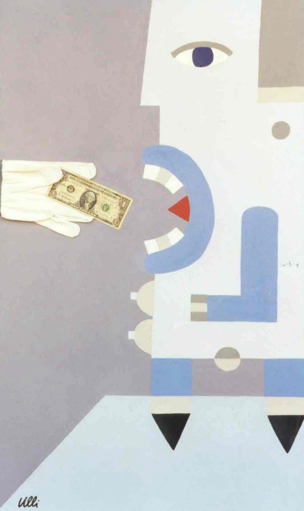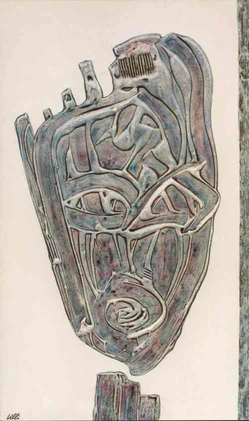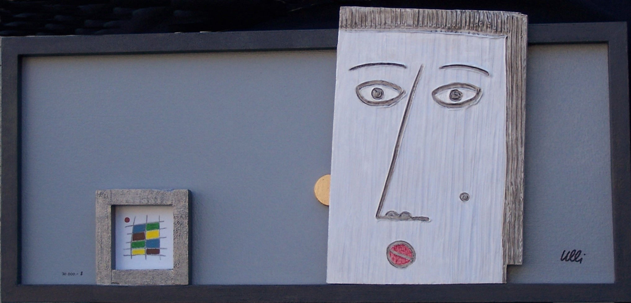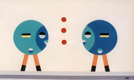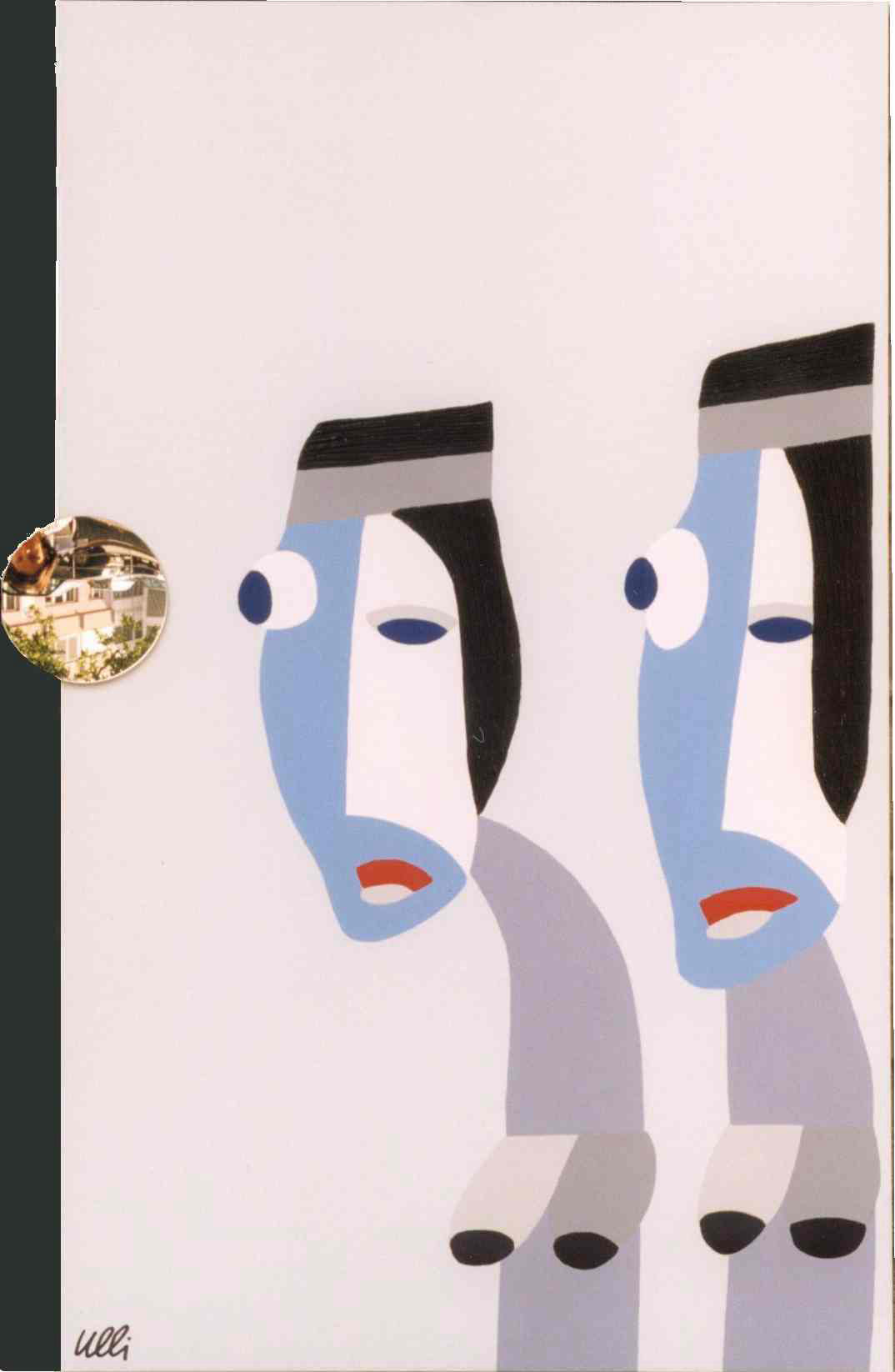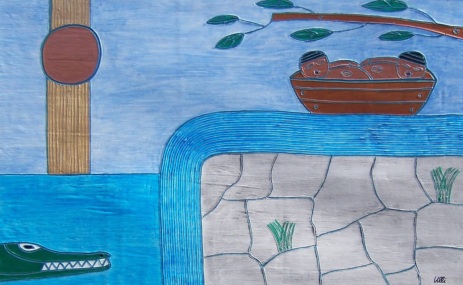 Die Figuren ähneln dem vorherigen Bild, sie sind nun alle gleichmäßig verteilt, scheinen festgebunden, gefesselt? Der Raum im Hintergrund öffnet sich und gibt eine Blick in den vom Mond erleuchteten Nachthimmel frei. Ein rätselhaftes Bild voller Tiefe...